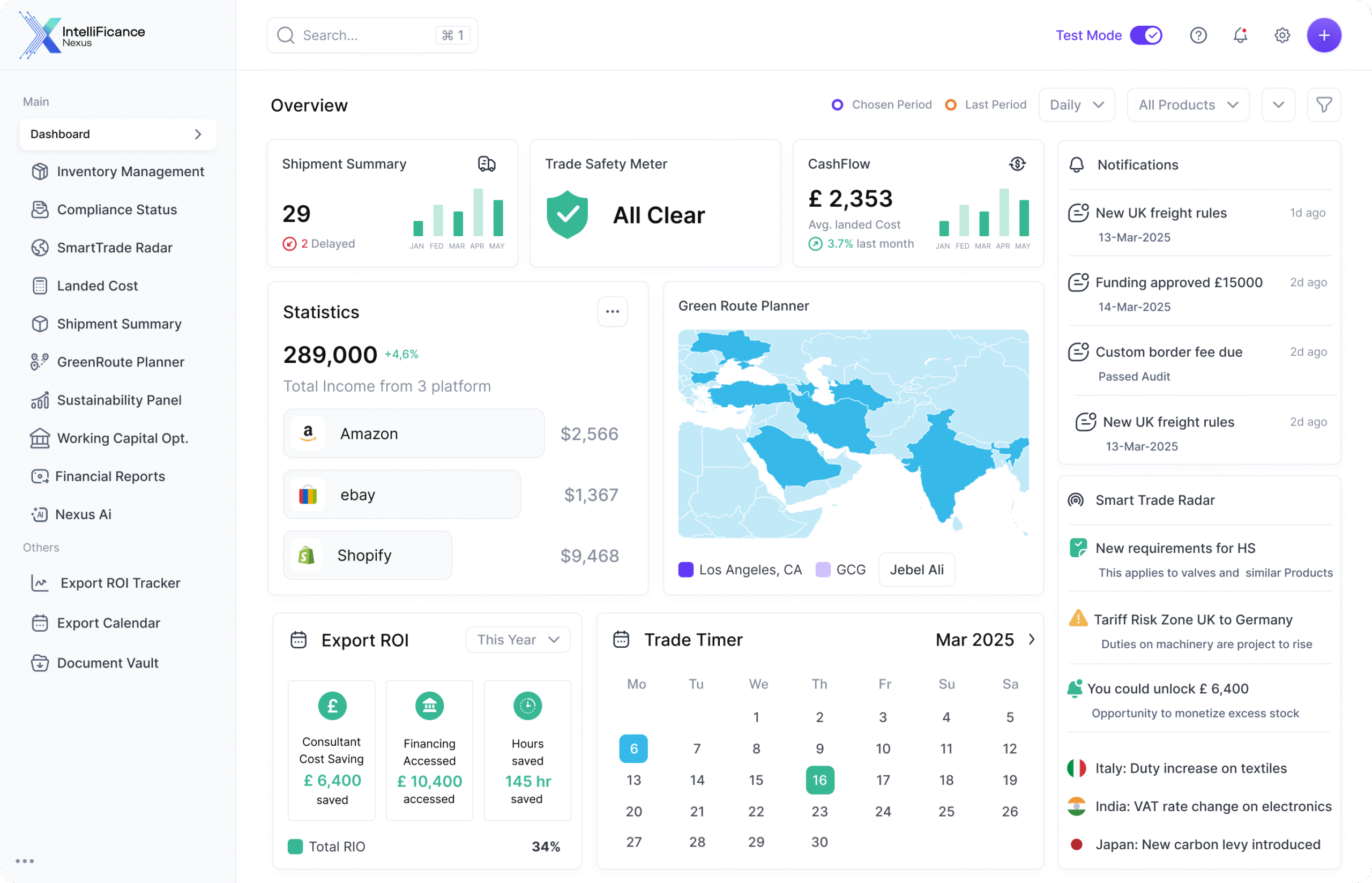 IntelliFinance Nexus empowers UK exporters to adopt greener trade practices with features like carbon-aware route planning, real-time ESG reporting, and a sustainability dashboard. Track, reduce, and report your environmental impact while meeting upcoming UK and EU carbon compliance regulations. Make global trade cleaner, smarter, and future ready.